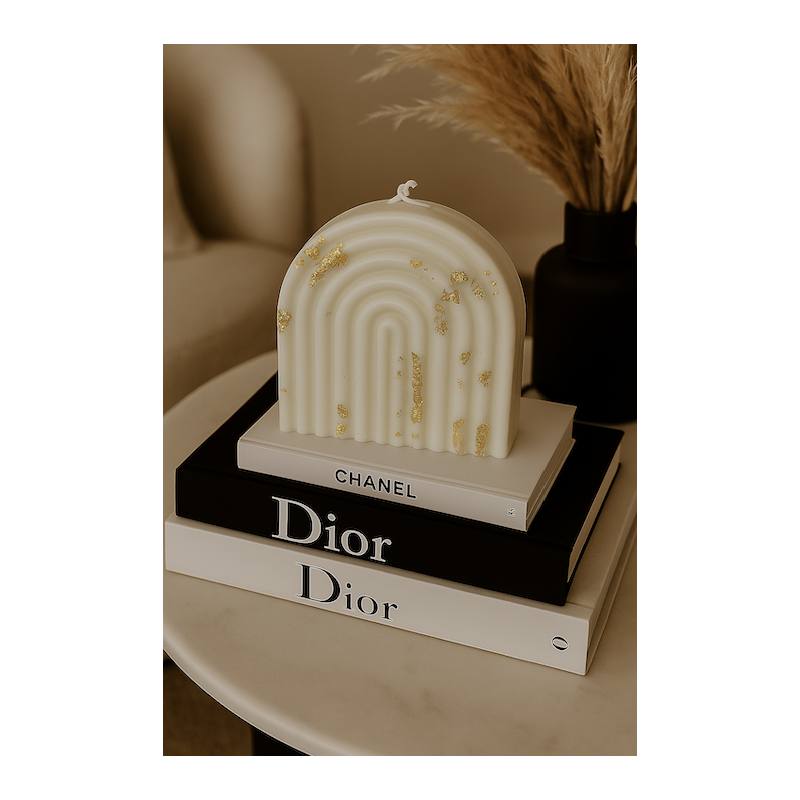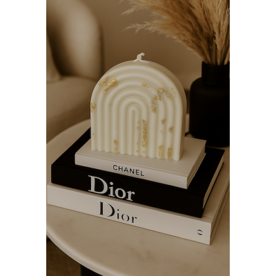 Ideal para destacar en espacios contemporáneos como una sala moderna o una repisa decorativa, esta vela en forma de arco llama la atención con su elegante diseño minimalista y toques de pan de oro que añaden lujo sin excesos. Su forma limpia y armoniosa evoca serenidad y estilo. Perfecta como pieza decorativa por sí sola o como regalo distintivo.